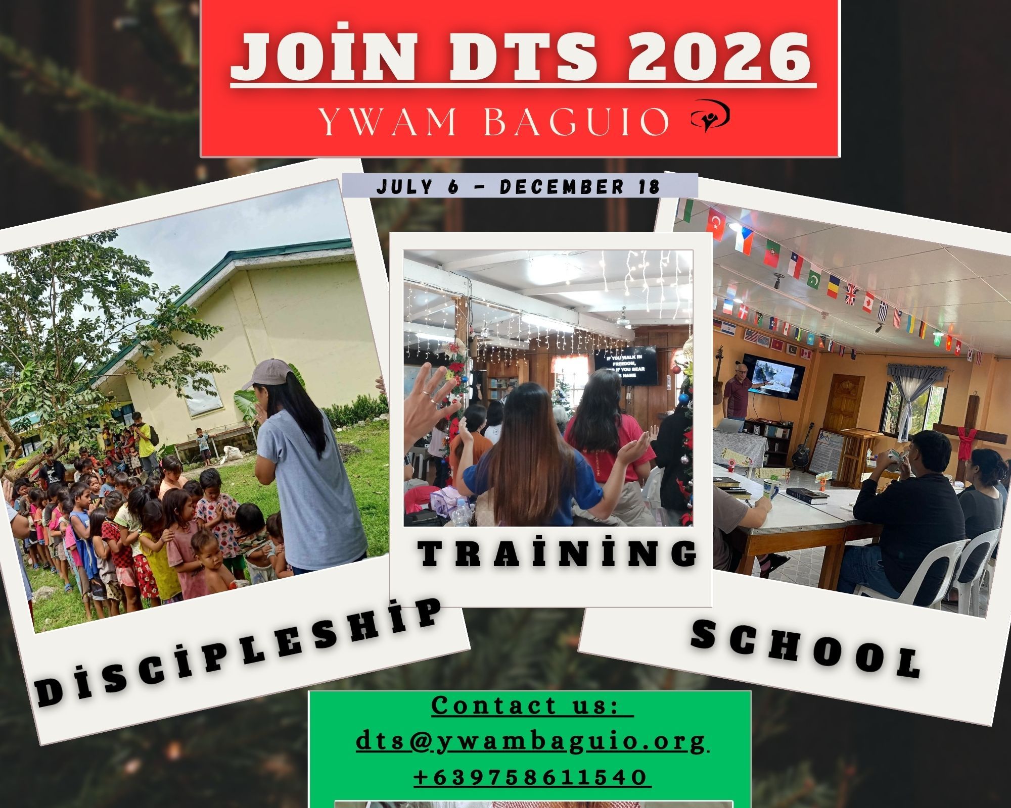The YWAM-DTS is an intensive Christian training course beginning with a 12-week lecture/teaching phase followed by an 8 to 12-week practical field assignment. The YWAM-DTS is designed to encourage students in personal character development, to deepen a living relationship with God and to identify their unique individual gifts and callings in God.